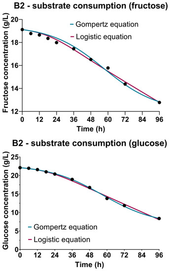 The sugar substrate consumption kinetics were studied by performing regression analysis and numerical optimization from the experimental data, and generating the models using the Luedeking-Piret equation based on the microbial growth kinetic parameters determined by the Gompertz and the logistic equation (Table 2). The requirements of the microorganisms regarding the carbon source could be observed from the perspective of the nutritional requirements necessary for reproduction and growth, but also for the purpose of cell maintenance, explained by non-growth activities such as macromolecules turnover, reparation of damaged cellular components, osmoregulation and cell mobility [59,60]. The coefficient indicating the contribution of substrate consumption to cell multiplication and growth, directly proportional to the growth rate, is marked as α (gsubstrate/gbiomass), and the other one β (1/h), describes the substrate consumption to the maintenance of the cells during the stationary growth phase, proportionally to the biomass concentration. Better model fitness in the case of B1, i.e., CW-based medium used in cultivation of Bacillus sp. BioSol021, was observed when using the microbial growth parameters obtained by the logistic equation, taking into account a higher R2 value (0.9908) compared to the Gompertz equation (0.9771) (Table 2). The parameters of the Luedeking-Piret model indicated higher values of α coefficients; 3.470 gsubstrate/gbiomass and 1.410 gsubstrate/gbiomass when using kinetic growth parameters defined by the Gompertz and the logistic equations, respectively, indicating a more significant influence of the substrate consumption on producing microorganism cell growth. Lower levels of β coefficients are observed for both models; in the case of kinetic growth parameters from the Gompertz equation, 0.0053 1/h, and in the case of the logistic equation, 0.0336 1/h, implying lower nutrient requirements for cell maintenance during the stationary cultivation phase. In the case of the second experimental set, B2, performed using WFW-based medium, similar R2 values indicated excellent model fitness for both models, and for both carbon sources, fructose and glucose. A slight advantage for the mathematical description of glucose consumption in the WFW-based medium could be given to the growth parameters obtained by the Gompertz equation (R2 0.9991) compared to the logistic equation (R2 0.9961). The opposite could be said for fructose consumption, with R2 values of 0.9920 and 0.9874 for the parameters obtained by the logistic and the Gompertz equations, respectively. Regarding sugar source consumption for reproduction and non-growth activities, it could be concluded that according to the Luedeking-Piret equation parameters, glucose was the preferred carbon source, contributing the most to the growth of the producing microorganism with the value 4.331 gsubstrate/gbiomass. The growth coefficient value for fructose obtained using the Gompetz equation’s growth parameters was 1.974 gsubstrate/gbiomass, while the coefficients describing non-growth related activities were 0.0010 1/h and 0.0015 1/h for fructose and glucose, respectively. The use of the growth parameters of the logistic equation confirms the greatest contribution of glucose to the reproduction of the producing microorganism, with a growth-related coefficient value of 0.7416 gsubstrate/gbiomass, compared to contributions to cell maintenance described by the β coefficients with values 0.0211 1/h for fructose and 0.494 1/h for glucose (Table 2).