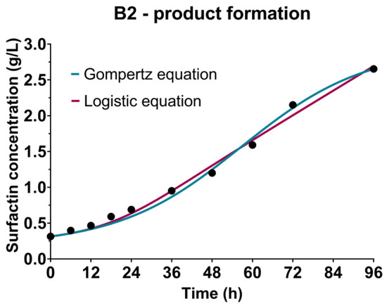 The kinetic growth parameters previously determined using the Gompertz and the logistic equation were used as a basis for product - surfactin formation kinetics, described by the Luedeking-Piret equation. As could be seen in the case of B1-cultivation based on the CW medium (Table 2, Figure 4), higher values of both coefficients of the Luedeking-Piret equation were predicted by using the kinetic growth parameters obtained by the logistic equation, also showing higher R2 value (0.9897) compared to the Gompertz equation (0.9841). On the other hand, a better fitting of the experimental data in the case of B2 (WFW-based medium) was achieved using the kinetic growth parameters from the Gompertz equation (Table 2, Figure 4). According to Gaden’s classification of the formation mode of the product, based on the values of the product formation constants γ and δ [72], surfactin biosynthesis was partially related to the growth of Bacillus sp. BioSol021 as it had been classified as Class II, where γ ≠ 0 and δ ≠ 0, which can also be observed by comparing the experimental data presented in Figure 2 and Figure 4.