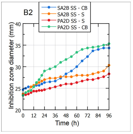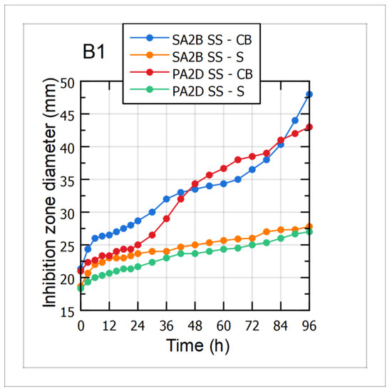 Antimicrobial activity of the Bacillus sp. BioSol021-based biocontrol agents against the aflatoxigenic Aspergillus flavus strains SA2B SS and PA2D SS using the food industry effluents-based media for the cultivations of the producing microorganism: B1—cheese whey from dairy industry, B2—winery flotation wastewater, CB—cultivation broth, S—supernatant.