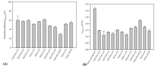 In order to select the DES which would enable the highest glycerol extraction efficiency, the extraction process was carried out at a temperature of 25 °C, a biodiesel:DES volume ratio of 1:1 and a residence time of τ = 0.05 min. The selected volume ratio of biodiesel and DES was based on the literature data [11] where all free glycerol from palm oil-based biodiesel was removed exactly with that ratio. The temperature was selected in order to minimize process costs by avoiding heating of the system. The short residence time was chosen to ensure fast screening of selected DESs and based on the previous research [8] where glycerol was removed from biodiesel in 0.22 min. In addition, a longer residence time was not chosen at that point simply to avoid complete glycerol extraction because in that way it would not be possible to choose the best DES. The obtained results are presented in Figure 2A,B.