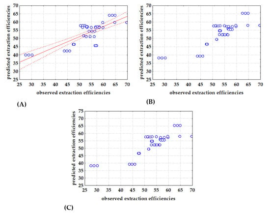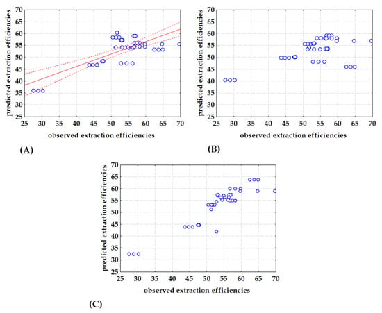 Comparison between observed and (A) MLR, (B) NLR and (C) PLR predicted extraction efficiencies based on DESs physical properties (−regression line, ⋅⋅⋅⋅ 95 % confidence interval).