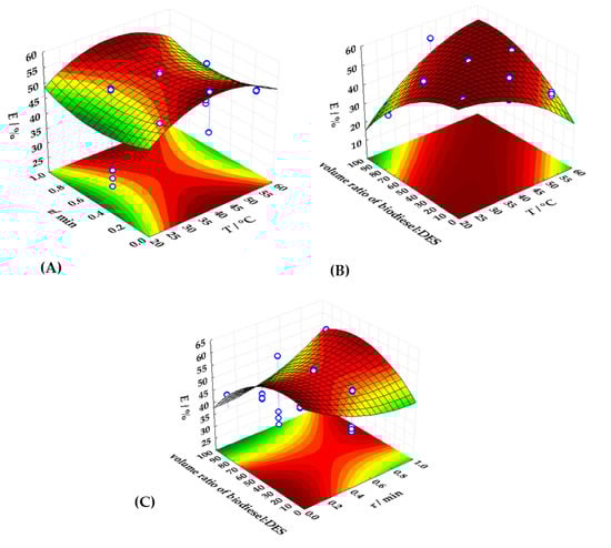 Three dimensional response surface plot for the interaction between (A) extraction temperature and residence time, (B) extraction temperate and biodiesel:DES volume ratio and (C) residence time and biodiesel:DES volume ratio.