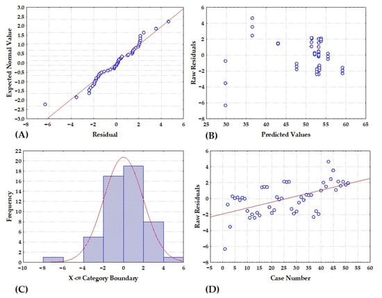 Given that a high R2 value does not ensure that the model would fit the data well, residual analysis was also carried out. The results of the residual analysis are shown in Figure 6. Residuals were distributed approximately around the line (Figure 6A), and histograms depicting residual classification (Figure 6C) exhibited a distinctive bell shape, confirming the assumption of normality. Furthermore, by examining the plots of residuals vs. estimated values (Figure 6B), it is clear that the residuals were randomly distributed, indicating high agreement between the model and the experimental data. The residual analysis further revealed that the sequence of the experimental runs had no effect on the results, since the residuals distributed themselves around zero (Figure 6D). The acquired results suggest that the proposed response surface model was reliable for the examined range of input variables.