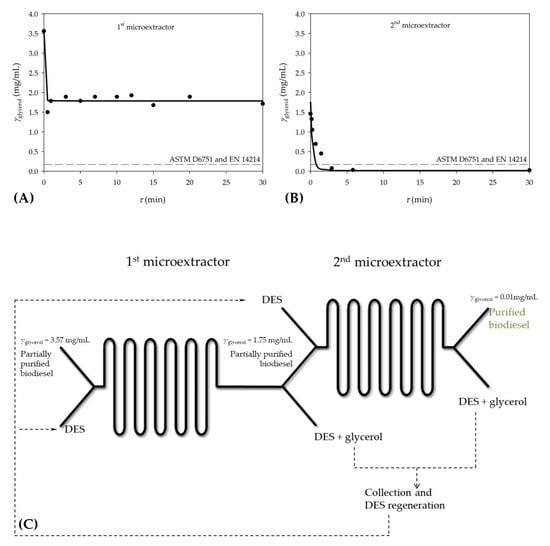 Based on the obtained results, an integrated system (Figure 7C) was proposed as a possible solution for continuous glycerol extraction. In that system, partially purified biodiesel would enter the microextractor as one process stream and DES as the other one. As reported in our previous work [8], a stable and parallel flow is formed in this system, with the interface located exactly in the middle of the microextractor channel. This allows for complete phase separation at the outlet of the microextractor. Biodiesel that now contains 50% less glycerol than partially purified biodiesel at the inlet of the 1st microseparator is fed into the 2nd microextractor along with fresh DES, resulting with purified biodiesel at the exit. All DES waste streams could be collected, regenerated and returned to the process, making the proposed system more sustainable.