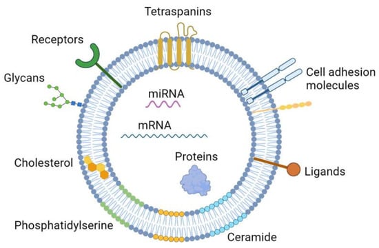 All cells share the ability to secrete extracellular vesicles (EVs), phospholipid bilayer membrane structures enclosing a portion of their own cytoplasm []. These vesicles are able to transfer their cargo of biomolecules, including proteins, lipids, and nucleic acids, triggering alterations in recipient cells [,,]. For this reason, EVs play essential roles in intercellular communication, being associated with multiple physiological and pathological processes.