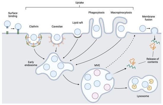 EVs can also be internalized through multiple EV uptake pathways [] (Figure 2). EVs can undergo clathrin-mediated endocytosis, through the formation of a clathrin coat in a portion of cell membrane surrounding the EV to be internalized []. This clathrin coat promotes membrane deformation, which results in membrane invagination and formation of a bud that surrounds the EV that then pinches off, separating itself from the membrane []. Once in the cytosol, this internalized vesicle undergoes clathrin un-coating. EVs can also be internalized by clathrin-independent endocytosis, such as caveolin-mediated endocytosis, involving the formation of cave-like invaginations in the plasma membrane named caveolae, which become internalized into the cell (similarly to clathrin-mediated endocytosis) [,]. Caveolin-1 is required for the formation of caveolae, which are also rich in cholesterol and sphingolipids. Clathrin-independent endocytosis may also occur via lipid rafts []. These plasma membrane microdomains have altered phospholipid composition, being more tightly packed and consequently less fluid, but float freely in the plasma membrane. Lipid rafts can be found in invaginations formed by caveolin-1 or in planar regions of the plasma membrane associated with flotillins []. However, lipid raft-mediated endocytosis of EVs seems to be caveolae-independent [,].