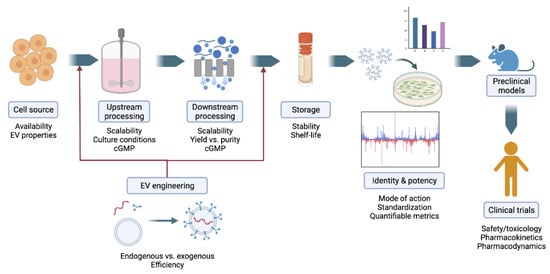 Of note, there is still a gap in our knowledge concerning how the upstream conditions influence the characteristics and the quantity of produced EVs. For instance, in the context of the manufacturing of monoclonal antibodies, the optimization of upstream conditions was able to lead to improvements of 10–100-fold in product titers over the years []. Therefore, by adjusting operational parameters in the process such as the composition of culture media, oxygen concentration, materials used, as well as the cell passage, level of confluency, and viability, one can expect substantial improvements in EV yields.