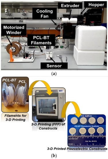 Three-dimensional printing, or additive manufacturing, is a high-powered fabrication technique that can produce parts of any complex architecture, shape, and dimension layer by layer. In recent years, even though there has been a surge in the application of 3D printing to manufacture biomedical devices, very few reports have focused on developing bioactive and regenerative piezoelectric implants utilizing this process. The majority of the focus was on using 3D printing to develop biosensors, not bioactive and regenerative implants. []. For instance, Grinberg et al. [] developed Polyamide-11 (PA-11) and BaTiO3 3D-printable composite filaments and used the fused deposition modeling technique to print proof-of-concept models of piezoelectric sensors to monitor the applied force on the knee prosthesis. Furthermore, even though researchers used 3D printing to develop regenerative scaffolds, they utilized complex techniques. For instance, Jiang et al. [] developed porous BaTiO3 scaffolds with the help of digital light processing (DLP) technology, but it required sintering as an additional processing step to develop the scaffolds. On the other hand, Polley et al. [] used the binder jet 3D printing technique to develop porous HA-BaTiO3 scaffolds. Similarly, Yang et al. [] used selective laser sintering (SLS) to create graphene and BaTiO3-based scaffolds. However, both SLS and binder jet involve long wait times after the printing process, processing complexities, and rigorous thermal-post treatment such as sintering.