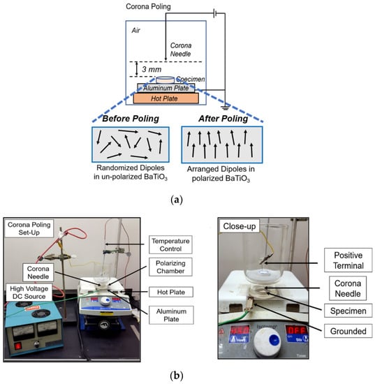 Polarization of the PCL-BT scaffolds. (a) Schematics of the Corona Poling setup. (b) Digital image of the coronal poling setup.