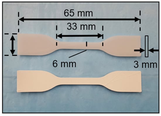 The mechanical testing specimens were 3D printed according to the dimensions mentioned in ASTM D638 (Figure 4). The same 3D printing parameters were followed as mentioned in Section 2.4 to develop/print the dog-bone-shaped tensile specimens. Subsequently, the specimens were mounted on a Universal Testing Machine (UTM). An Instron 3369 UTM with a 50 kN load cell was used for the tensile tests. Then, 5 mm/min strain deformation was used to measure the specimens’ tensile strength, and 1 mm/min strain deformation was used to measure the modulus, as per ASTM standards.
