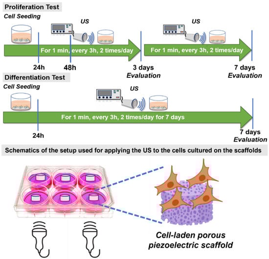 Schematics showing the routine for applying the US on the PCL-BT piezoelectric scaffolds.
