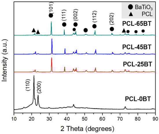 Figure 6 shows the XRD plots of the various PCL-BT composite specimens. The unmodified PCL specimen exhibits sharp and well-defined peaks corresponding to the polymer. Specifically, two major peaks at the 2θ angles of 21.4° and 23.8° can be observed. These two peaks correspond to the (110) and (200) crystallographic planes of the semi-crystalline nature of PCL biopolymer, respectively [,]. However, incorporating BaTiO3 in the PCL matrix markedly reduced the intensity of the PCL diffraction peaks, and instead, new high-intensity and well-defined diffraction peaks were spotted. These peaks correspond to BaTiO3 as per JCPDS: #34-0129 [,]. The highest diffraction peak corresponding to BaTiO3 can be spotted at the 2θ angle of 30°, which corresponds to the (101) lattice plane. Furthermore, the other low-intensity yet sharp and well-defined peaks of BaTiO3 correspond to (111), (002), (112), (202), and (103) lattice planes []. Furthermore, the well-defined nature of the BaTiO3 diffraction peaks indicates the high crystallinity of the BaTiO3 particles. These findings are in accordance with previous studies that dealt with PCL- BaTiO3 composites, as mentioned in Ref [].