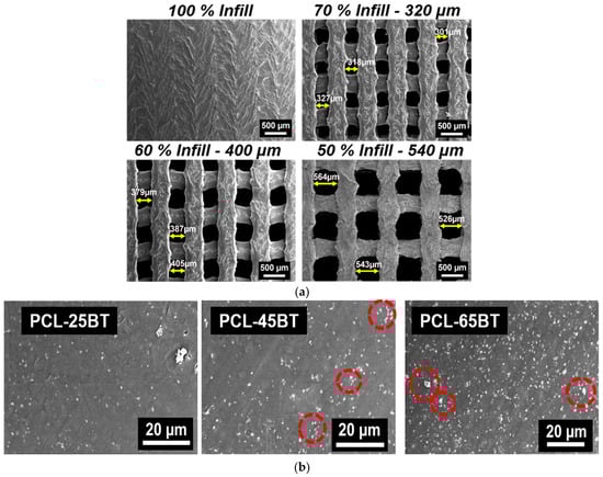 The SEM micrographs in Figure 7a indicate the presence of uniform-sized and interconnected pores in the PCL-BT composite scaffolds. The average pore sizes of the scaffolds are mentioned in the image headers. Similar to our previous efforts in developing scaffolds with highly consistent geometry and uniform-sized pores, FFF stands out to be a highly efficient yet sustainable manufacturing technique for developing scaffolds with controlled pore sizes and geometry [,]. Previous studies focused on developing porous BaTiO3-based piezoelectric scaffolds using conventional methods such as freeze casting [] or particulate (salt)-leaching []. However, even though such techniques can form porous scaffolds, there is little to no control over the pore size and geometry. Moreover, the probability of creating interconnected pores critical for cell nutrient flow might be less when using such conventional methods. As opposed, FFF is a powerful yet simple technique to develop scaffolds with highly consistent interconnected pores that should be leveraged to develop porous piezoelectric scaffolds [].