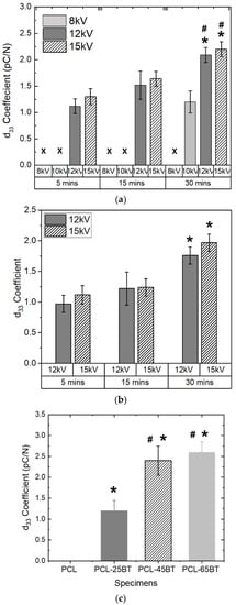 d33 coefficient (picoColoumbs/Newton, pC/N) of (a) dry and (b) wet PCL-BT scaffolds with respect to the poling voltage and time. # means statistically significant (p < 0.05) with respect to the specimen poled at 10 kV in the same group (30 min). * means statistically significant (p < 0.05) with respect to the specimens poled for 5 and 15 min. (c) d33 coefficient of various wet PCL-BT scaffolds. * means statistically significant (p < 0.05) with respect to PCL. # means statistically significant (p < 0.05) with respect to PCL-25BT.
