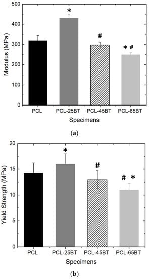 Mechanical testing of the composite specimens. (a) Young’s modulus and (b) yield tensile strength of the 3D-printed PCL and PCL-BT scaffolds. * means statistically significant (p < 0.05) with respect to PCL. # means statistically significant (p < 0.05) with respect to PCL-25BT.