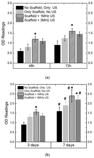 Ultrasonic stimulation (US) and in vitro properties of the scaffolds. OD readings of MC3T3 cells as cultured on the piezoelectric scaffolds (PCL-65BT) with respect to different intensities of US over (a) 72 h and (b) 7 days. * means statistically significant (p < 0.05) with respect to “no scaffold, only US”. # means statistically significant (p < 0.05) with respect to the specimens in the “3 days” group.