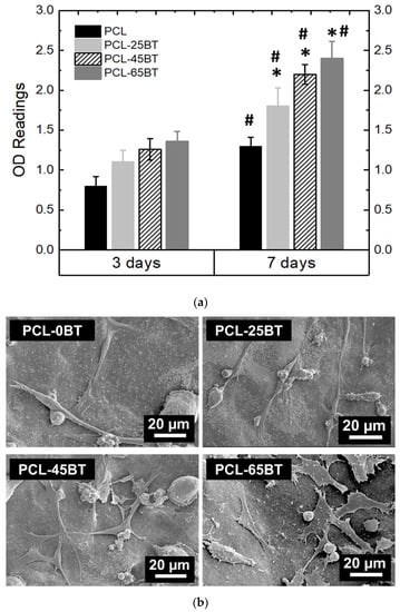 Figure 11a confirms that the BaTiO3 presence in all the composite scaffolds significantly increased the cell growth kinetics over time as compared to the non-piezoelectric PCL scaffolds. This is due to the increased piezoelectric response resulting from the BaTiO3 content in the PCL-BT composites. However, even though there was a significant difference in the extent of cell proliferation as compared to the PCL scaffolds, there was no significant difference in the extent of cell proliferation among the various PCL-BT specimens. The SEM images (Figure 11a,b) of the adhered pre-osteoblast cells on various 3D-printed scaffolds corroborate the proliferation results. Very few cells adhered to the scaffolds after day 1 of the culture (Figure 11a). In addition, many circular and spindled cells were seen, indicating that these cells did not have time to spread over the surface with their filopodia. However, after day 7 of the culture, it is evident that the cells proliferated notably and spread over the scaffolds with extending filopodia, as shown in Figure 11b. Furthermore, it is evident that the increasing BaTiO3 concentration in the composites results in enhanced cell adhesion and spreading. In all the cases, the cells approvingly adhere and spread on the surface with flattened morphology, signifying that the PCL-BT scaffolds exhibit a bioactive and biocompatible surface. The increasing cell adherence and spread over the composites with increasing BaTiO3 concentration demonstrate that the scaffold-generated piezoelectric effect played a major role in cell spreading []. The increasing BaTiO3 particles enhance the piezoelectric effect, which helps the cells to proliferate and spread more rapidly on the scaffold surfaces. However, even though more cells proliferated and were seen to adhere on the PCL-45BT and PCL-65BT specimens as compared to PCL-25BT specimens, there was not a significant difference in the amount of adhered cells on all the composites. Similar results were obtained by Tang et al. [], where the authors observed no significant difference in the osteoblast proliferation on the composite scaffolds containing different contents of BaTiO3 (80 and 90 wt% BaTiO3). Similarly, Tavangar et al. [] reported no significant difference in cell adhesion and proliferation between the composite scaffolds with varying BaTiO3 (40, 50, and 60% wt BaTiO3). This could be possible because the BaTiO3 particles are embedded in the polymer or ceramic matrix, and in most cases, they are not directly interacting with the cells; hence, the variation in BaTiO3 presence does not play a significant role in cell proliferation [,]. Instead, we believe that the extent of the piezoelectric effect generated from the BaTiO3 particles influences cellular activities more prominently than the biocompatibility nature of the BaTiO3.