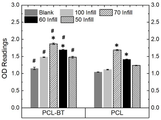 OD readings of MC3T3 cells cultured on the piezoelectric scaffolds (PCL-65BT) with different infill (pore sizes); 1 MHz US was used per the routine for all the proliferation tests. * means statistically significant (p < 0.05) with respect to the controls (Blank and 100 Infill specimens) in the same group. # means statistically significant (p < 0.05) with respect to the PCL specimens with different infills.
