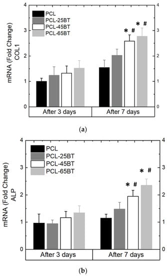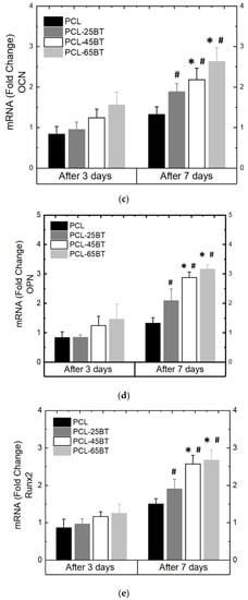 Figure 13a–e show the differentiation behavior of the MC3T3 pre-osteoblasts over time when exposed to the US treatment and the piezoelectric scaffolds. As per previous reports, we selected the 3 MHz US for the differentiation studies and observed that the 3 MHz treatment effectively differentiates pre-osteoblast cells into osteoblasts. All the piezoelectric PCL-BT scaffolds upon US application increased the mRNA expressions notably of all the osteogenic gene markers not after 3 days, but after 7 days of culture. This is usual, as the gene markers explored in this present case are observed in stages of osteoblastic differentiation, and it usually takes longer than 3 days for the MC3T3 pore-osteoblasts to differentiate [,,,]. Notably, the PCL-45BT and PCL-65BT specimens markedly increased the ALP, Col-1, OPN, OCN, and Runx-2 expressions, which are critical in osteogenesis.