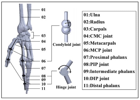 The physiological structure of the hand can be revealed by analyzing the existing model of the hand skeleton in the OpenSim library. The skeleton of the hand capitates near the wrist, metacarpals, and phalanges segments. In the hand skeleton, all digits contain 1 metacarpal segment. The 4 fingers have 3 segments, namely, proximal, intermediate, and distal phalanxes. The thumb possesses 2 phalanx segments, which are proximal and distal phalanxes. The joints of the hand are named according to the bones to which they connect. Consequently, there is 1 metacarpophalangeal joint (MCP), 1 distal interphalangeal joint (DIP), and 1 proximal interphalangeal joint (PIP) for the 4 fingers, while the thumb contains only 1 MCP and 1 DIP joint (Figure 1). In addition, there is a carpometacarpal joint (CMC) for each digit near the wrist.