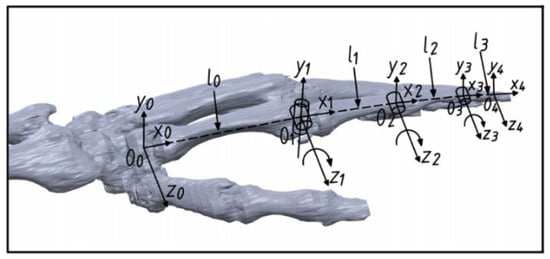 Considering all the possible gestures/actions performed by the hand, the skeleton of the hand plays an essential role in posture support, and the length of each digit stays approximately the same during the rotation process. Taking the index finger as an example, we treat the metacarpal bone as a fixed base frame and the metacarpal bone, proximal, middle, and distal phalanxes form an open-chain four-linkage mechanism. For a grasping action, the 3 DoFs in the four-linkage mechanism are all rotational, and the rotation angle ranges are 0–90°, 0–110°, and 0–70° for MCP, PIP, and DIP, respectively. Based on a modified hand skeleton model (Figure 2), D-H parameters (Table 2) of the equivalent four-linkage mechanism are established to study the kinematics of the hand, where O0 is the coordinate system fixed at one end of the metacarpal close to carpals (CMC joint) and the O1, O2, O3, and O4 coordinate system is located at the geometric center of the MCP, PIP, DIP, and fingertip, respectively.