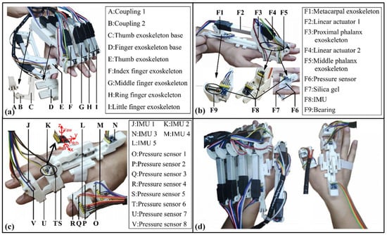 Consider the interaction and force transmission between the hand and wearable exoskeletons, fingers and exoskeleton are tightened by the presence of elastic silica gel (inset of Figure 5b). The exoskeleton rotation axes and finger rotation axes are lined up to minimize the possible relative sliding between exoskeleton linkage and human phalanges. Regarding the friction between linkages and actuators, miniaturized bearings are adopted. For each digit, 4 thin-film pressure sensors are sandwiched between the silica gel (both dorsal and palmar sides) and digit holder. In addition, 3 IMUs are installed in the exoskeleton in the labelled position of Figure 5b. Adopting the design of the hand exoskeleton, a wearable controller without an actuator is assembled with a pressure sensor and IMUs installed in the positions labelled in Figure 5c. This wearable controller is designed for HMI, which is thoroughly discussed in Section 3.