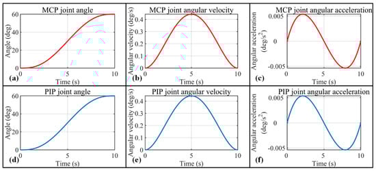 We assume 10 s is required for MCP and PIP joints to rotate 60°, taking and as the start and end time for both joints, and the 6 parameters in Equation (3) are presented as follows: