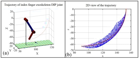 Workspace of exoskeleton worn by index finger. (a) The DIP joint workspace of the index finger driven by index finger exoskeleton; (b) 2D view of the DIP joint workspace for the corresponding index finger exoskeleton.