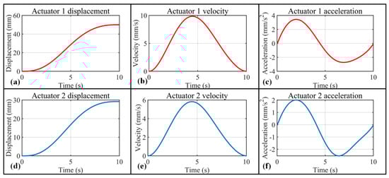 For the grasp action defined in this section, the displacement, velocity, and acceleration for linear actuators 1 and 2 are presented in Figure 10.