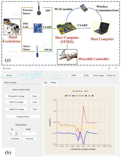 The overall control system is composed of four major parts, including the hand exoskeleton, host computer, slave computer (STM32-F329 microcontroller, manufactured by Zhengdianyuanzi Ltd., Guangzhou, China), and a wearable controller (Figure 11a). The host computer processes data collected by the slave computer and sends commands via the interface program developed in the QT environment. As shown in Figure 11b, the interface program possesses two basic functions including mode selection and data visualization. The slave computer integrates one analog-to-digital converter (ADC) and one serial port transmission module and controls the linear actuator via pulse width modulation (PWM).