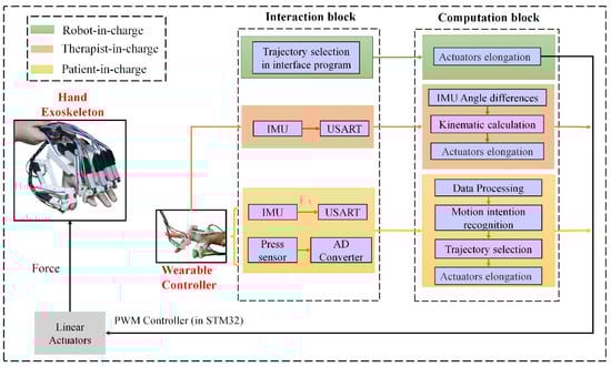 Figure 12 illustrates the control flow diagram for the three rehabilitation modes, where the robot-in-charge mode is presented by green blocks. Based on the rehabilitation therapy suggested by the doctor, the trajectory of each exoskeleton joint can be planned with the aid of Equation (2), and the corresponding elongation in the linear attractors is calculated via Equation (4). In the rehabilitation process, the real-time data collected by the thin-film pressure sensors installed in the hand exoskeleton (Figure 5b) can be monitored by doctors and the data can be used as a recovery evaluation index.