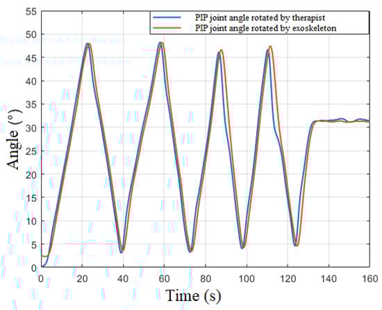 With the aid of the slave computer, the real-time PIP joint angle variation of the therapist’s index finger is obtained. IMUs installed in positions of the hand exoskeleton are similar to the positions in the wearable controller (Figure 5b), and the angle variation in each joint of the hand exoskeleton can also be calculated with the aid of Equation (5). Utilizing Equation (4), the demanded elongation of the linear actuator installed in the exoskeleton is calculated. Figure 13 indicates the decent real-time performance of the therapist-in-charge training mode.