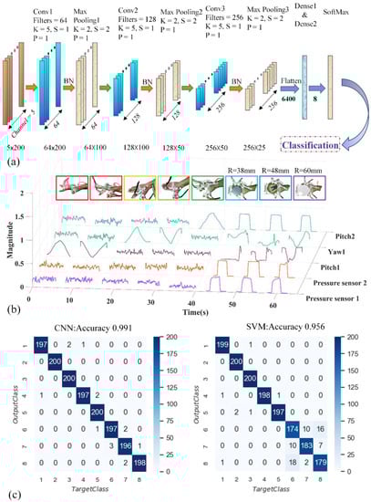 Deep Learning and machine-learning-based intention recognition. (a) 1D CNN structure diagram; (b) sensor output data pattern of the six actions/gestures; (c) confusion matrix diagrams of CNN (left panel) and SVM (right panel) models.