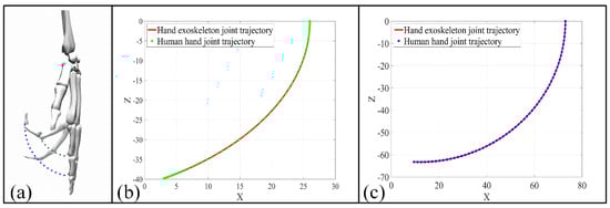 Exoskeleton trajectory validation for DIP and PIP joints. (a) Opensim simulation setup; (b) trajectory of DIP joints; (c) trajectory of PIP joints.