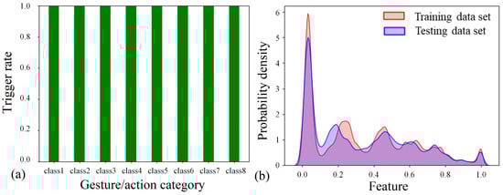 Reliability of the sensor-device synergy. (a) Trigger rate of all sensors necessary for gestures/actions; (b) probability density distribution for random training and testing data sets using KDE.