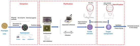 In order to increase the purity and quantity of extracted components, the processes for extraction should be optimized. Briefly, existing processes for the extraction of brewed lees biological functional components include separation (hydrolyzation), purification, identification and function active testing (Figure 2). Initially, macromolecular substances are hydrolyzed into a micromolecular mass. For instance, focusing on the target protein, rice residues can be hydrolyzed by multiplying proteases (such as amylase, cellulase and proteases). Zhao, et al. [78] prepared the rice residues by alkaline protease (protamex), showing a higher protein recovery with low molecular weight peptides (<3000 Da). After hydrolyzation, some crude components can be hydrolyzed, adsorbed and intercepted in the purification process. In this step, physical treatment can increase the extraction and purification efficient, such as solid–liquid extraction, grinding, microwave-assisted extraction, ultrasound-assisted extraction, thermal explosion and high-pressure extraction [79,80]. With the assistance of physical technology, more energy can be supplied for the mass transmission or modification of the physical structure of the material for components’ explosion. Therefore, water soluble components (liquor part) can be separated from HL (solid part) efficiently. The ultrafiltration membrane can intercept hydrolyzed substances (liquor part) into different fractions by molecular weight. The purification of the remaining part need to be tested after the separation. Not only the purity should be tested, but the bioactive capacity of extracted components should also be analyzed. The function actives of the remaining part can first be tested by in vitro analysis. For example, DPPH and ABTS radical scavenging assays are common approaches to determinate the comportments’ antioxidation activity. The inhibitory activities of the components against α-glucosidase are tested for hypoglycemic capacity. Once the bioactive capacity and purification of the substance obtains the target requirement, the structure can be identified by HPLC with quadrupole time-of-flight mass spectrometry/mass spectrometry (HPLC-Q-TOF-MS/MS) or liquid chromatography–mass spectrometry (LC–MS) [81,82]. For instance, some studies have reported that peptides contain specific amino acid residues, such as Asp, Pro and His, take stronger antioxidant activities [83]. For further function active assays, performed in vivo, some studies have investigated the intestinal potentially activated signaling pathway, variation of the microorganism community metabolism, blood glucose levels and serum inflammatory in the extracted lees components [84].