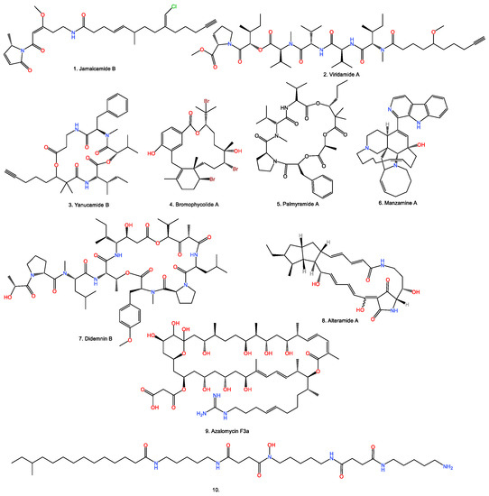 - Xu, Y.; Kersten, R.D.; Nam, S.J.; Lu, L.; Al-Suwailem, A.M.; Zheng, H.; Fenical, W.; Dorrestein, P.C.; Moore, B.S.; Qian, P.Y. Bacterial biosynthesis and maturation of the didemnin anti-cancer agents. J. Am. Chem. Soc. 2012, 134, 8625–8632. [Google Scholar] [CrossRef] [PubMed]