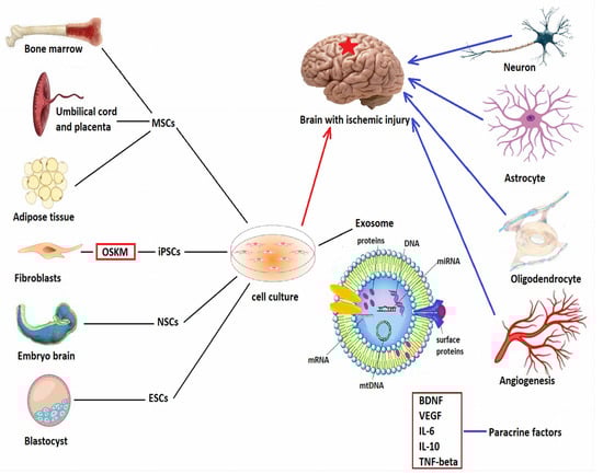 Embryonic pluripotent stem cells (ESCs) are derived from the inner layer of the blastocyst, Neural multipotent stem cells are obtained from human fetal cortex, mesencephalon, or spinal cord. Mesenchymal multipotent stem cells can be harvested from bone marrow, umbilical cord and placenta, or from adipose tissue. There is also the possibility of obtaining induced pluripotent stem cells (iPSCs) via transduction of the four OSKM genes: octamer-binding transcription factor 4 (Oct4), sex-determining region Y-box 2, (Sox2), the Krupellike factor 4 (Klf4), and the avian myelocytomatosis viral oncogene homolog (c-myc). Once harvested, stem cells are cultured in special culture medium, where they release exosomes carrying proteins, DNA, messenger RNA (mRNA), microRNAs (miRNA), and mitochondrial DNA (mtDNA). Once delivered to the brain by various routes, they differentiate into neurons, astrocytes, and oligodendrocytes, and release various growth factors (such as brain derived neurotrophic factor-BDNF or vascular endothelial growth factor-VEGF) and anti-inflammatory cytokines (interleukins IL-6, IL-10, or tumor necrosis factor β), which modulate neuroinflammation and promote angiogenesis, neurogenesis, neural differentiation, and synaptogenesis.