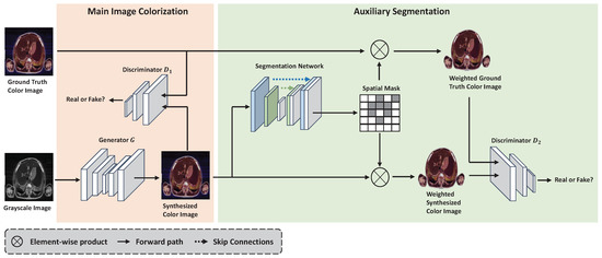 Different from scribble-based methods and exemplar-based methods, fully automatic approaches based on deep learning perform colorization in an end-to-end manner without any human intervention [15,16]. Recently, GAN-based colorization methods have been explored to perform fully automatic colorization. For example, Nazeri et al. proposed the deep convolutional generative adversarial network (DCGAN) [15] to perform end-to-end colorization by directly learning the mapping between the input grayscale images and the corresponding colorized ones. Vitoria et al. [16] proposed ChromaGAN, an adversarial learning colorization approach with semantic information incorporated into it to colorize images more realistically. Although the aforementioned GAN-based methods have achieved promising results, these GAN-based methods mainly focus on adversarial training operated on the whole image while neglecting the various generated artifacts [17,18]. Some artifacts are produced because of appearance conflicts between the foreground objects and the background contents [19]. In medical images, background regions may not contain any tissues or organs and can be regarded as noise during the colorization process. Several works have been proposed to employ foreground-aware adversarial training to suppress the generated artifacts [19,20]. However, the effectiveness of foreground-aware adversarial training has not been investigated in image colorization for medical images. In addition, unlike most previous works that were limited to natural image colorization, this work focuses on the colorization techniques of medical images.