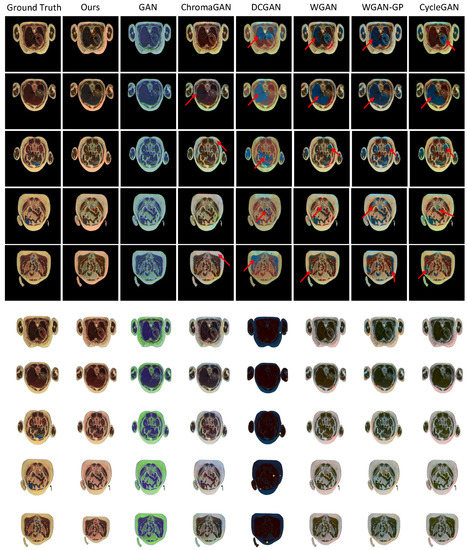 Disadvantages and future works. Although the proposed SMCGAN can generate relatively robust colorized images in most cases, there are still some failure cases, as shown in Figure 2. The color breeding artifacts still exist in some generated images. As there is no specific loss item for enhancing colors by considering the semantic information of medical images, it is difficult to identify the colors for organs or tissues at the pixel level when the background content changes significantly. Some previous works [53,66] have employed pre-trained VGG models to extract semantic information; these VGG models are trained on natural image datasets, which may not be capable of effectively capturing the semantic features for medical images due to the large discrepancy compared with natural images. In the future, we will develop new methods for medical image colorization while considering semantic information.