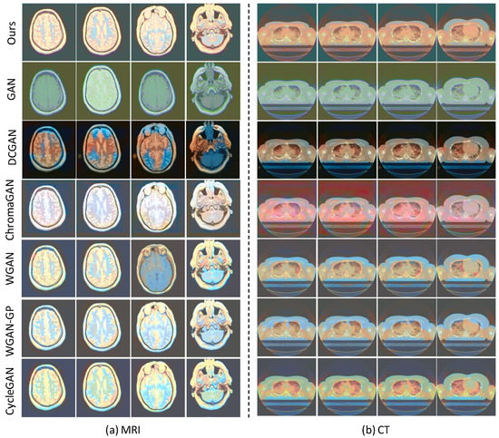 Imaging technology in biomedical engineering has made the interior portions of the body observable by doctors for disease diagnoses without having to invade the bodies of patients [1,2]. Medical imaging has also been used to guide and assist surgical procedures [3]. For instance, in keyhole surgeries, can help doctors reach the interior parts without really opening too much of the body. Medical imaging utilizes fundamental physical phenomena, including acoustic wave dissemination and X-ray propagation, to obtain the health parameters of patients. With the emergence of advanced medical imaging devices, a large number of medical images have been generated and collected at an unprecedented speed and scale using imaging techniques such as computed tomography (CT), magnetic resonance imaging (MRI), and ultrasound imaging (UI) [4]. Thus, it is critical to develop medical image processing algorithms to help doctors diagnose and analyze diseases rapidly. Among them, medical image colorization is an important topic attracting more and more attention [5]. Synthesized color images can enrich the details of organs and tissues much more compared with gray images [6,7]. They can help doctors identify problems more accurately and avoid misjudgment [8].