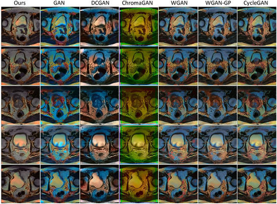 To evaluate the generalization capability of the proposed SMCGAN in colorization qualitatively, we also produce visualization colorization results of different GAN-based image colorization methods using MRI and CT datasets, as illustrated in Figure 3 and Figure 4. It is to be noted that ground truth color images are not available in these datasets. Consequently, we evaluated the performance through a perceptual analysis, including color naturalness and color bleeding removal. From the results in Figure 3a, we can observe that the color of the colorized images generated by GAN are almost the same. It is not reasonable because different types of tissues should be rendered in different colors. This indicates that GAN fails to learn the mapping between different grayscale values and different chromatic values. In contrast, different tissues of colorized images in DCGAN are rendered in different colors. However, some color-bleeding artifacts exist between the borders of different tissues. For instance, the colors of some tissues bleed into the other tissues, as seen in the first column image of DCGAN. This shows that DCGAN fails to capture the semantic information when performing image colorization. Similar artifacts also exist in WGAN, WGAN-GP, and CycleGAN. The colorized images generated by ChromaGAN contain fewer artifacts than the other baseline methods. As ChromaGAN considers semantic information during image colorization, it is able to learn the relationship between tissues and colors. Compared with ChromaGAN, the colorized images generated by our proposed SMCGAN are more reasonable and natural as the colors are diverse and the structural details of the tissues are clearer. The results in Figure 3b are similar to those in Figure 3a. Both ChromaGAN and our proposed SMCGAN achieve better performance than GAN and DCGAN in terms of color naturalness and color-bleeding removal. As many details are missing in the CT images, it is more practical to compare the MRI images to test the colorization performance. From the image colorization results of prostate T2-weighted MRI in Figure 4, we can observe that the colorized images generated by our approach contain a clearer structure and fewer artifacts compared with those synthesized by the other image colorization algorithms. From these results, we can conclude that our approach is capable of generating robust results and reducing color-bleeding artifacts.