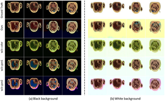 A comparison of colorization results under different ablation study settings. (a) Colorization results using images with black background as input; (b) Colorization results using images with white background.