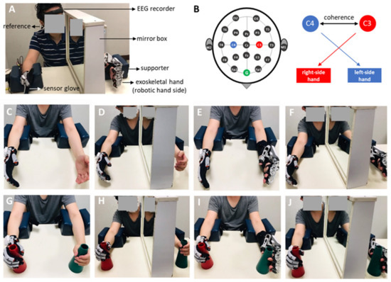 The experimental setup, analyzed electrodes, and the eight experimental conditions. (A) The experimental setup using the dry-electrode-based EEG recorder when the exoskeleton robot was applied on the participant. (B) The 10–20 EEG map, among which the coherence between C3 and C4 electrodes was analyzed, by assuming the right and left heads were controlled by the motor cortexes overlying the C3 and C4 electrodes, respectively. (C–J) The eight experimental conditions (using a factorial design of 2 object manipulation × 2 robot therapy × 2 mirror therapy conditions), including the unilateral hand movement without applying robot, mirror and object (C), conventional mirror therapy (D), robot-assisted bimanual training (E); robot-assisted mirror therapy (F); (G–J) were the trainings of (C–F) with object manipulation.