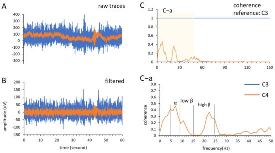where and are the PSDs of channels C3 and C4, respectively, and is the cross PSD between these two channels; the coherence () ranges from 0 to 1, and a coherence increment indicates greater interregional communication and vice versa. Next, each frequency band was acquired from the coherence spectrum and calculated using Equation (2), where is the data number of the collected frequency band, and is the frequency band (Figure 3C–a).