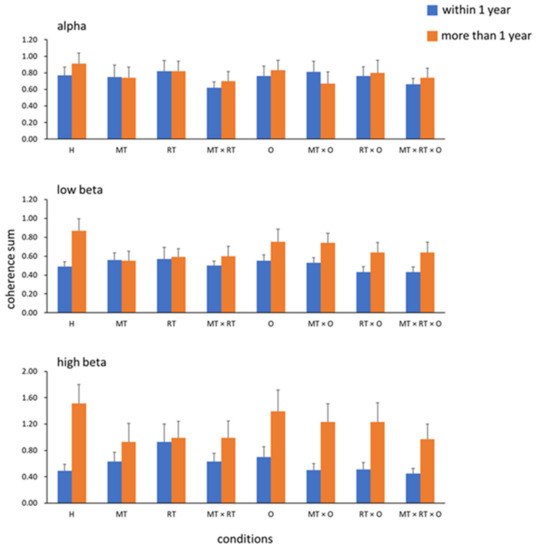 In the onset ≤1 year group, the three-way repeated-measures ANOVA showed no interaction effect in the alpha, low beta, or high beta bands. Although no significant main effect was found in the effects of MT, RT, and O factors, a significant main effect was observed on the RT × O condition in the high beta band (p = 0.01, ⴄ2 = 0.3) (Table 2 and Table 3). In the onset >1 year group, the three-way repeated-measures ANOVA showed no interaction effect in the alpha, low beta, or high beta bands. Next, we analyzed the main effects of the varied training conditions and found that the training with RT had significantly lower coherence than the without RT conditions in the high beta band (p = 0.04, ⴄ2 = 0.204); besides, in the high beta band, we also found the main effect in the condition of MT × RT × O (p = 0.048, ⴄ2 = 0.191), but no significant main effect in the other O conditions. We also found that the MT conditions had a significantly lower coherence sum in the alpha band (p = 0.012, ⴄ2 = 0.286), but not in the low or high beta bands. No significant main effect was found in the low-beta band (Table 4 and Table 5).