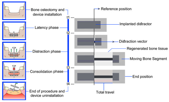 The DO technique has been researched continuously, beginning in 1987 with Ilizarov [6], who developed the DO technique. As the DO technique has progressed, distractors have continually been developed and improved, to allow for an optimal DO device [7]. Manual distractors can either be applied intra- or extra-orally. The first manual extra-oral distractor was developed by Ilizarov [6,8,9], after which manual extra-oral devices showed a high success rate, and caused the wide application of manual distractors in MRA [10]. DO consists of four predominant phases, including osteotomy, the latency phase, the distraction phase, and the consolidation stage [2,11]. A typical DO procedure in MRA, using an intra-oral manual distractor, is illustrated in Figure 1. The treatment begins with the osteotomy of the bone and installation of the bone-borne distractor (t1), after which the latency period commences (t2). The latency phase can typically last between three and ten days, and is the period in which the surgical site is allowed to heal and pass into the reparative phase. The restoration of the bone is likely to be observed by means of callus tissue, which has formed around and between the segments of the bone. The DO device is inactive during this period. The distraction period (t2–t3) is the period in which the DO device is active, and traction is applied such that there is a formation of woven bone fibers forming parallel to the distraction force (DF). The final phase is the consolidation period. The consolidation period (t3–t4) is the period in which there is an occurrence of the mineralization of the newly formed bone, while the DO device is inactive, and no DF is applied. This phase tends to exist after a period of a few days to a few weeks, based on the reconstruction conditions. Finally, the intra-oral distractor is removed (t4) [2,4].