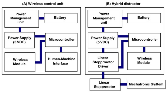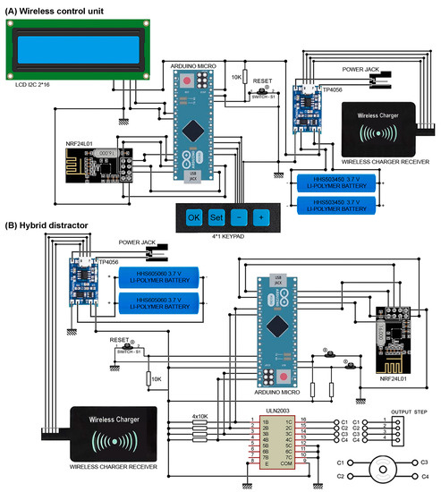 The detailed design of the control system: (A) Wireless control unit and (B) Hybrid distractor.