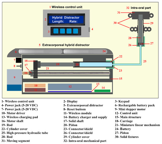 Figure 3 presents the detailed design of the control system of the hybrid distractor. In the wireless control unit, a liquid crystal display (LCD) and a membrane 1 × 4 keypad are used. The wireless control unit can be used to set, monitor, and modify the distraction parameters during the reconstruction process. In the wireless control unit, an Arduino MICRO A000053 development MCU board is used to control the performance of the wireless control unit, and to communicate with the hybrid distractor. In this unit, a wireless module, NRF24L01, is connected to the microcontroller to enable a wireless communication between the wireless control unit and the control system of the hybrid distractor. In addition, a power management system, the TP4056 battery charge controller, is connected to the supply of the system to supply 5 VDC and recharge the HHS503450 3.7 V lithium-polymer rechargeable batteries. In addition, a wireless charger receiver is implemented within the power management system for enabling the wireless charging of the batteries. The control unit transmits the data, including the set distraction parameters, to the hybrid distractor. After the input data is set, the operation can be run, using the wireless control unit.