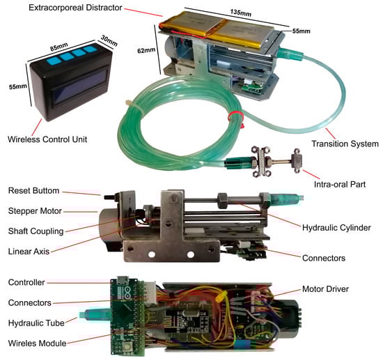 As presented in Figure 4, the carriage of the linear mechanism (18) is fixed to the rod of the hydraulic cylinder. The generated DF pushes the carriage precisely along a linear axis. Thus, the movement of the carriage is transferred to the hydraulic part of the mechatronic system. Subsequently, the generated DF pushes the hydraulic fluid inside the cylinder. A high-pressure hydraulic tube is connected to the output of the cylinder. The other side of the transition tube is connected to a miniature hydraulic cylinder, which is used in the intra-oral mechanical part of the distractor. By driving the stepper motor, the DF is generated and the hydraulic fluid is pushed and transferred to the intra-oral bone-borne distractor, through the flexible high-pressure tube.